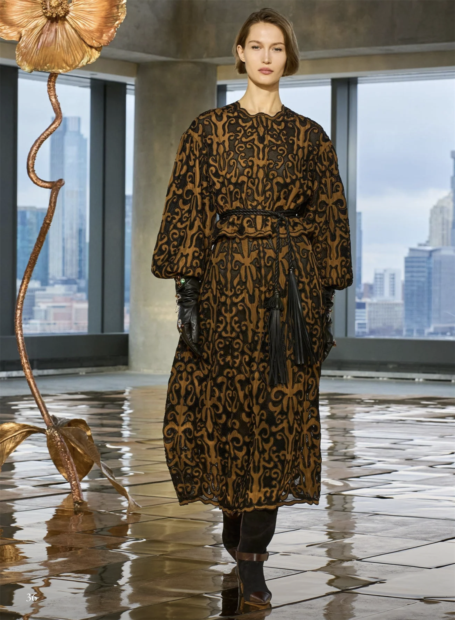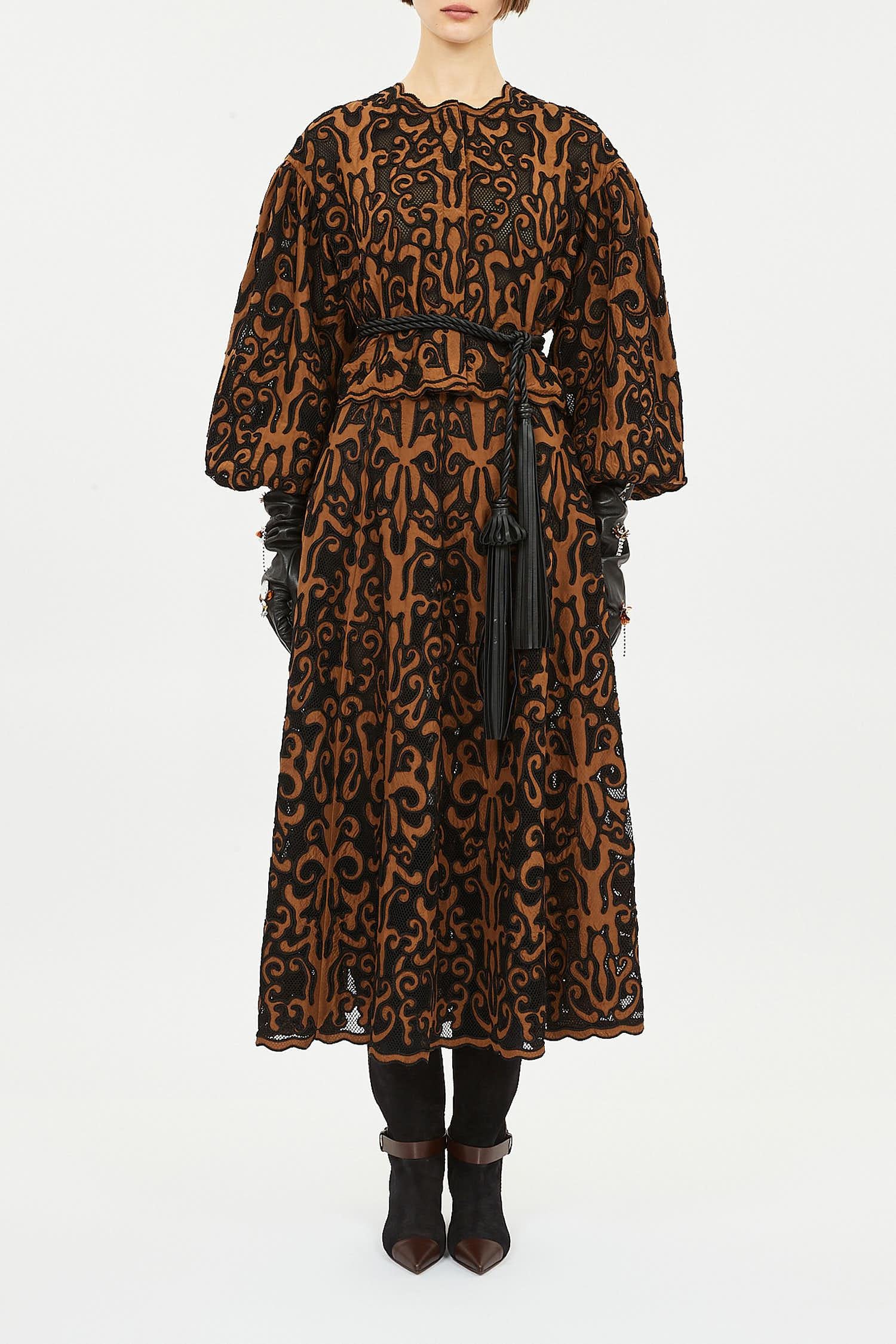 The Gili Skirt is exquisitely made from Victorian-inspired embroidered appliqué, set against delicate black mesh with intricate taffeta patchwork in rich saffron. This silhouette stands out with openwork that reveals and conceals, coordinating beautifully with the Gili Skirt for maximum impact as seen on the AW25 runway in Look 36.