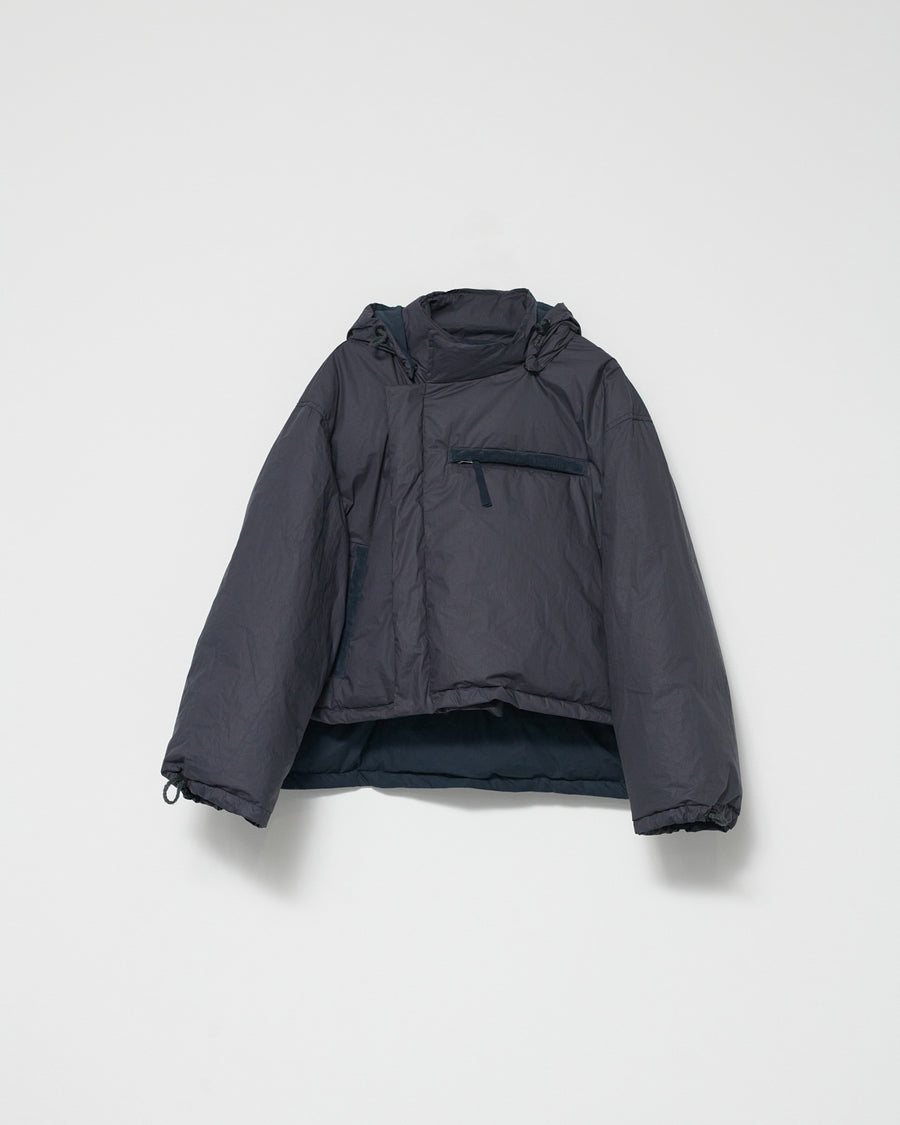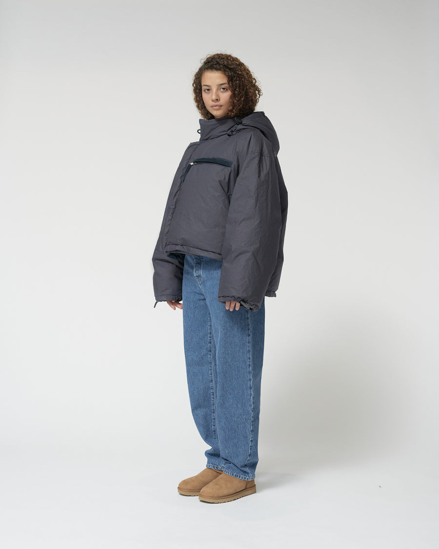 RE:DOWN WATER REPELLENT COTTON POPLIN PUFFER JACKET. THE PUFFER JACKET HAS A REMOVABLE HOOD AND AN ASYMMETRICAL ZIP AND BUTTON CLOSURE. SUEDE POCKETS AND DRAWSTRINGS IN HOOD AND SLEEVES. CORDUROY DETAIL ON HOOD AND SLEEVES. THE JACKET IS 10 CM LONGER IN THE BACK THAN THE FRONT.