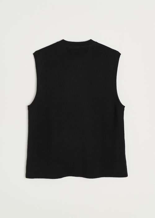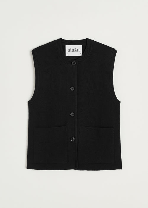 A refined vest made from mulesing free merino wool, knitted after the Milano technique - a detalied process creating a dense, unique material. Designed in a boxy fit with knitted tubular trims at the button closure and the sleeve opening.