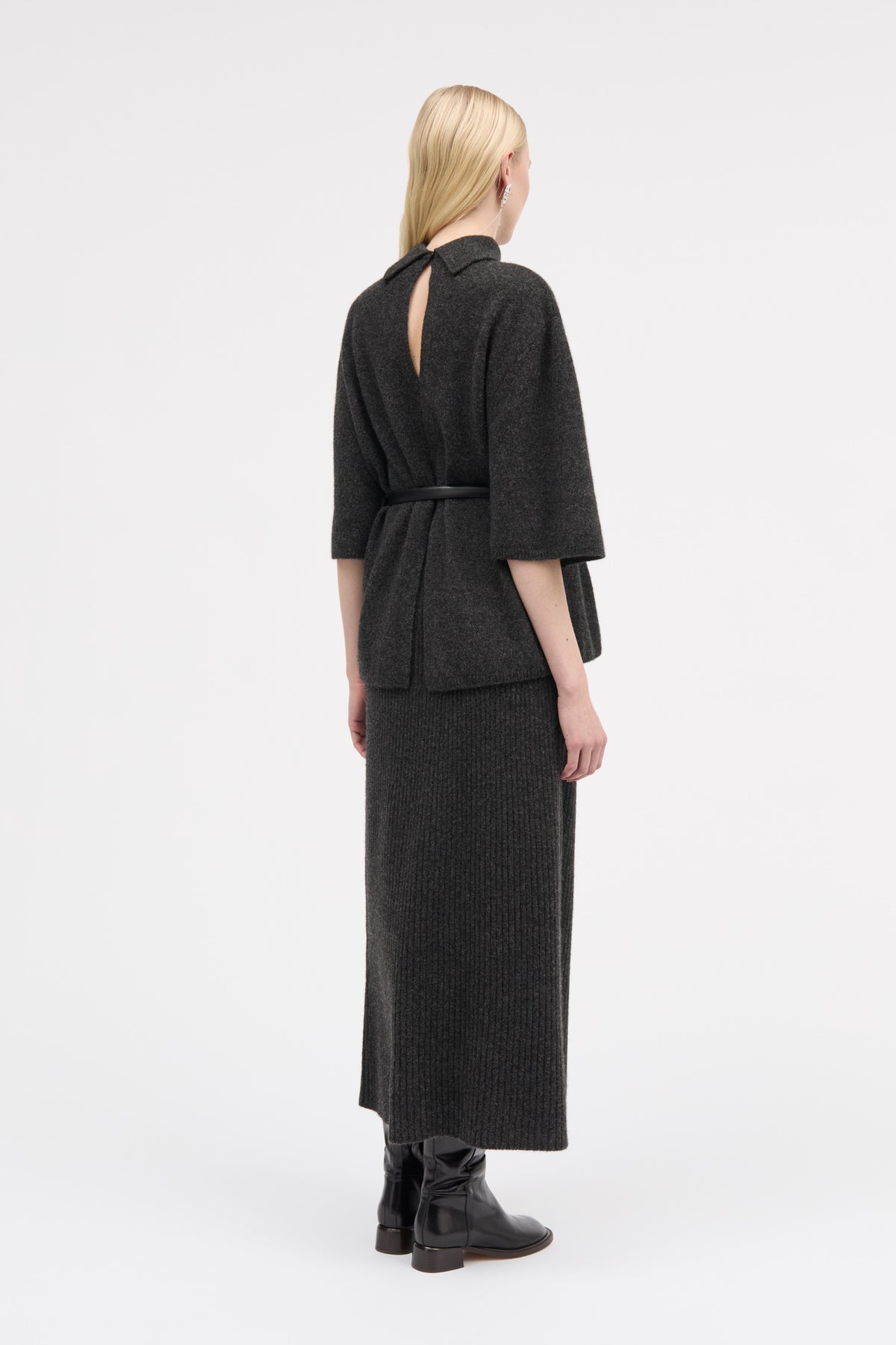 Discover the minimalist luxury of this dark grey melange knitted blouse, featuring bat sleeves and a loose fit. Perfect for those who appreciate refined and architectural design, this piece embodies a calm elegance rooted in Nordic aesthetics.