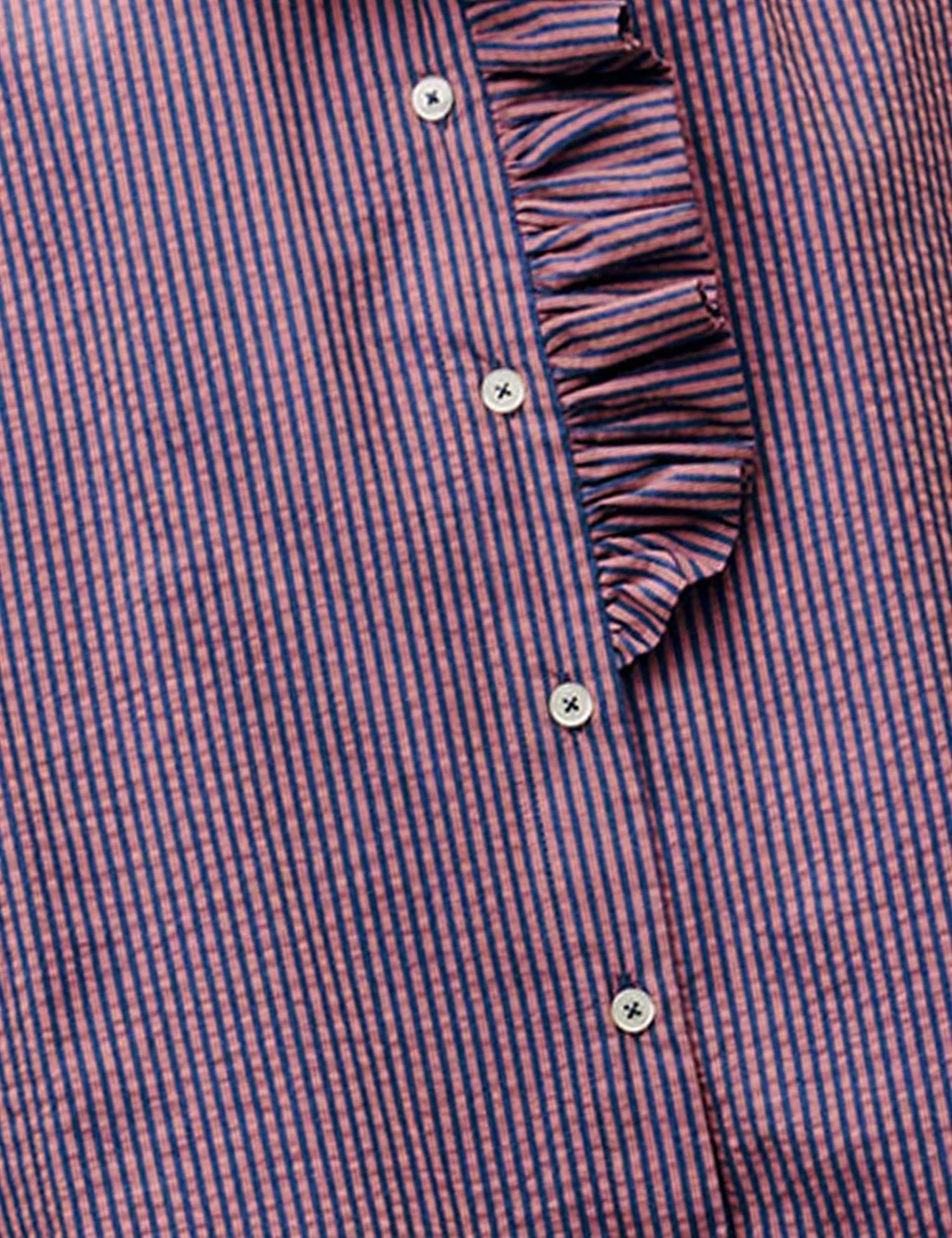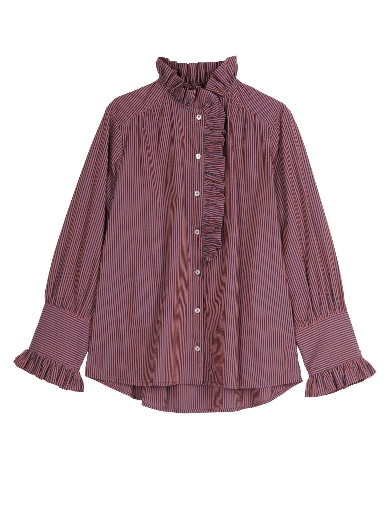 A bold take on a classic. Annemone Rollo merges sharp stripeswith dramatic ruffles, creating a modern twist on the traditional shirt. Her OEKO-TEX cottonis soft yet structured - a design that exudes both confidence and effortless sophistication.