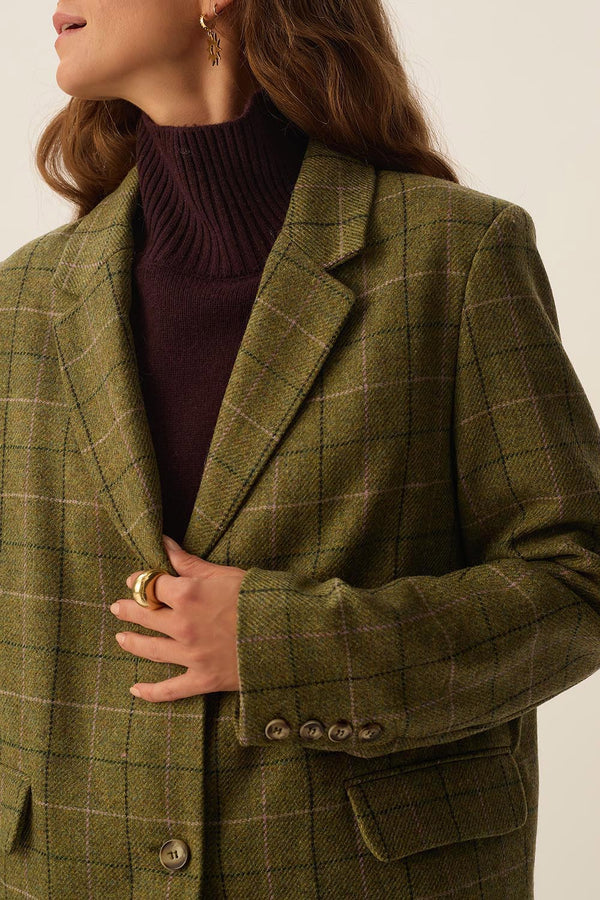 In a straight cut with shoulder pads for structure, Silvestre takes the classic tailored jacket and adds dotted checks on bold green wool fabric to create a preppy chic piece for winter.