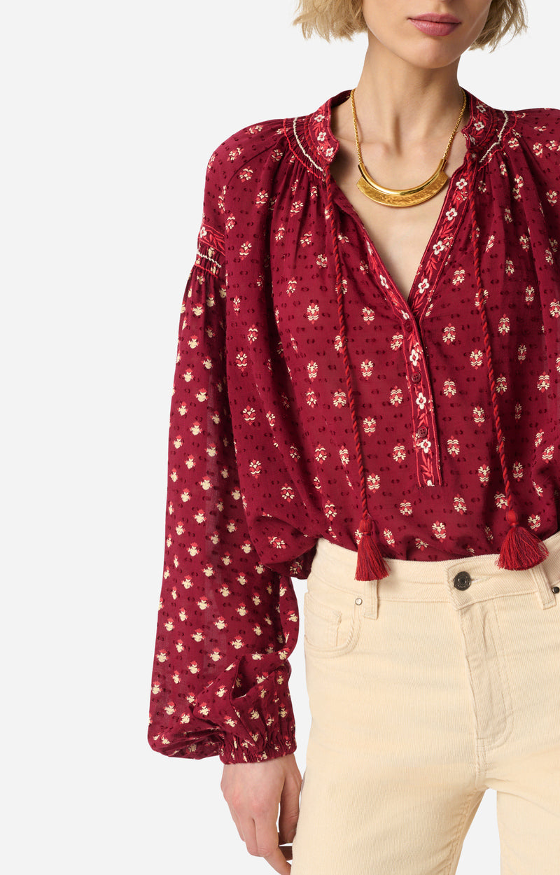 Light and feminine, this printed blouse charms with its flowing volume and puffed sleeves that add a soft bohemian touch. Its delicately gathered V-neckline structures the décolleté, offering a piece that is easy to wear and pair with everyday outfits.