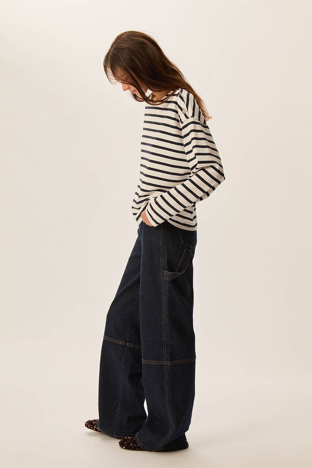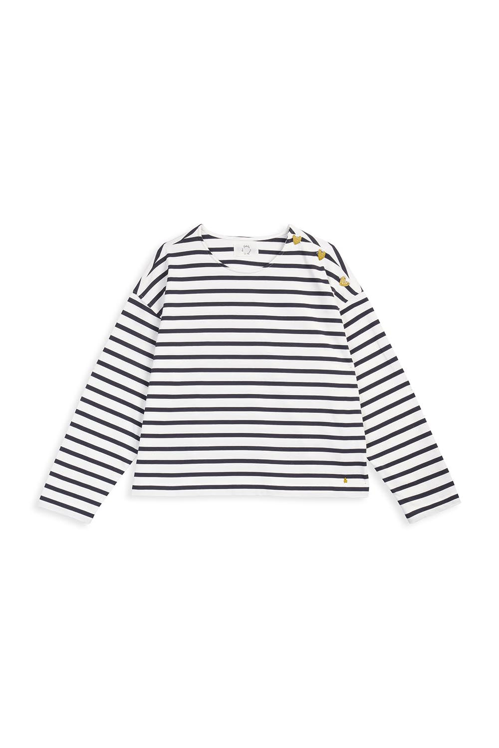 Exclusively created to celebrate the 25th anniversary of Des Petits Hauts, the Filoute striped top is made from thick cotton jersey that lasts, this collector's piece boasts gold-coloured heart-shaped buttons that nestle on the shoulder like shimmering jewels.