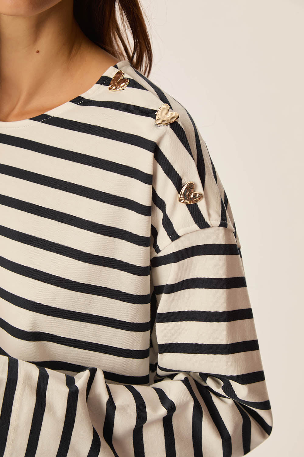 • Gold-coloured metal heart-shaped buttons on the shoulder