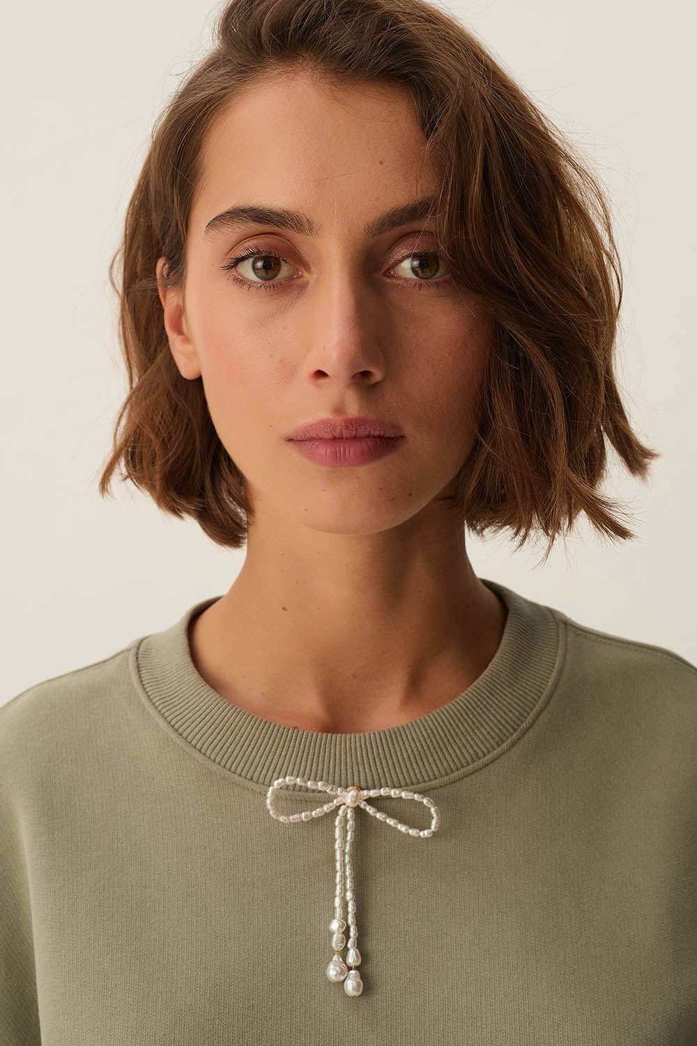 With its irregular beads and bow shape crafted by hand, the Nancy brooch is a pleasure to wear on a scarf or on a coat lapel.