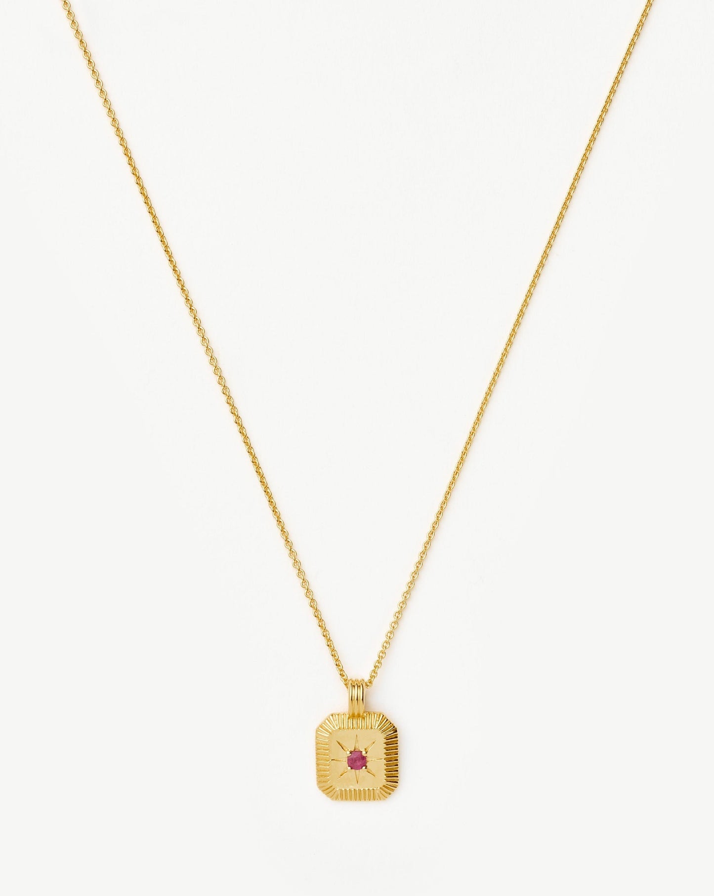 Bring your birth month a whole new meaning with a personalised gemstone necklace. The ridged pendant, held on a short chain necklace, holds a natural ruby gemstone, symbolising protection and prosperity, and is embellished with a central star motif. The perfect gift for anyone born in July.