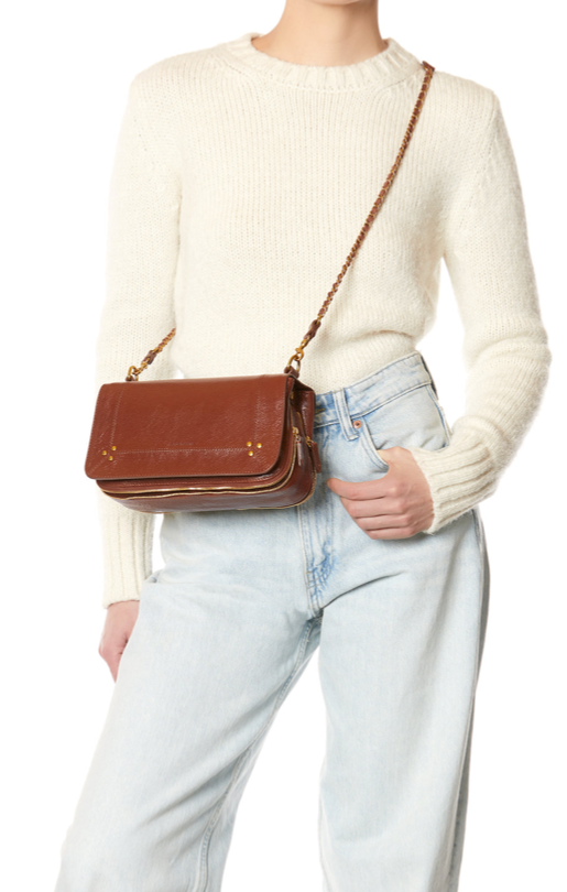 Leather and chain shoulder strap adjustable and two lengths : 65 cm or 105 cm. Leather flap with a double magnetic fastening. Three pouch compartments. Two zip gussets to adjust size. One detachable mirror and key hook inside.
