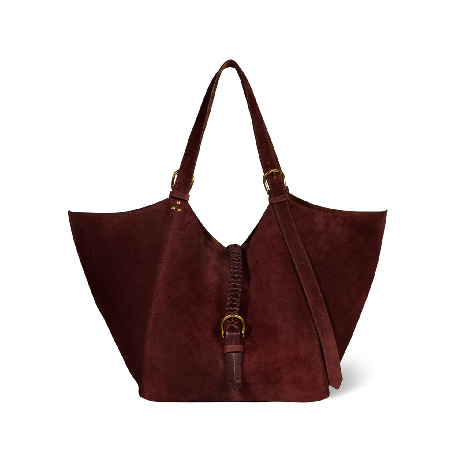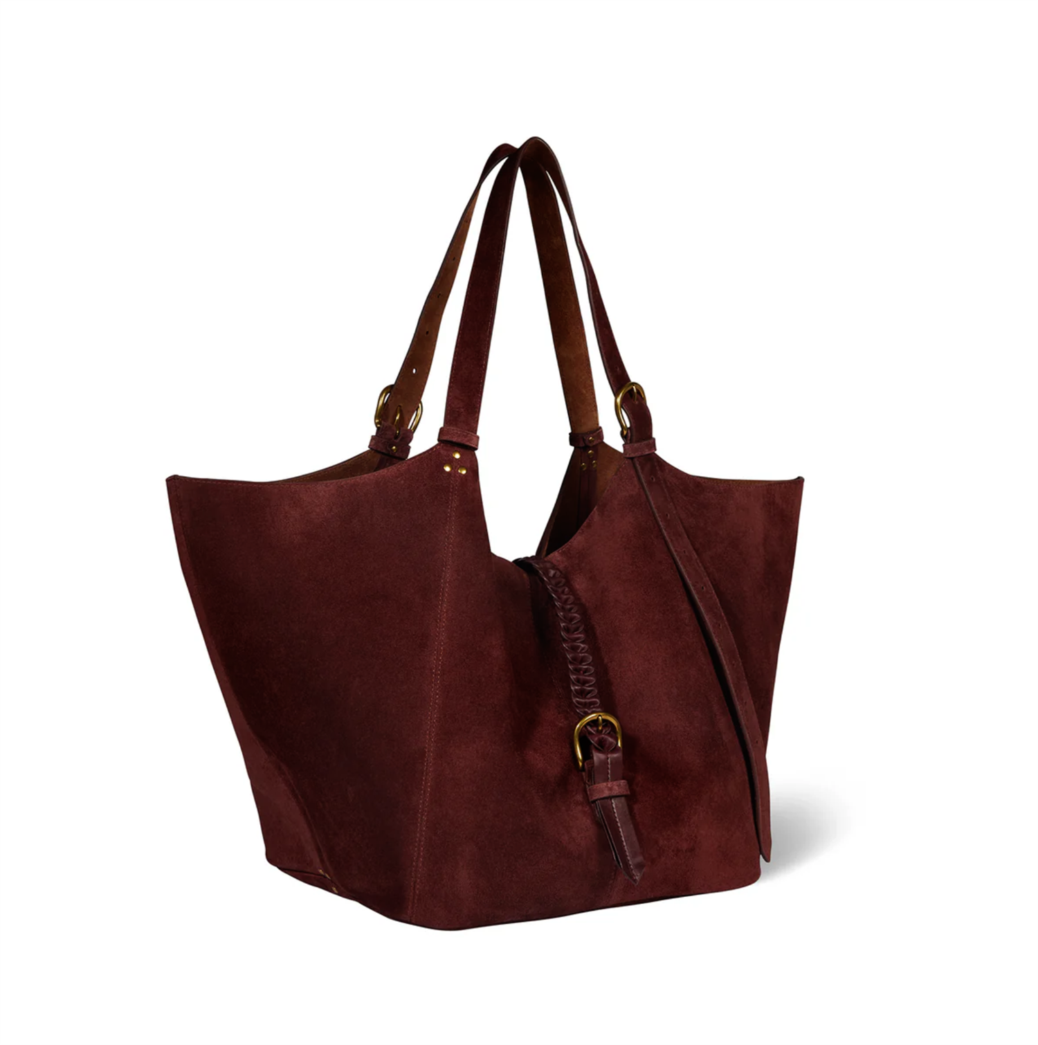 Bag with adjustable handles from 40 cm to 74 cm, allowing for hand or shoulder carry. Closure with a hand-braided central tab. Features a single main compartment with an interior flat pocket, as well as a pouch attached inside with a leather tie.