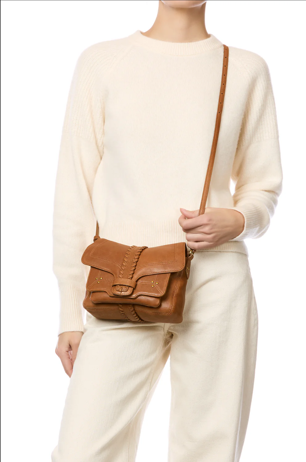 Its hand-braided flap fastens with a loop.