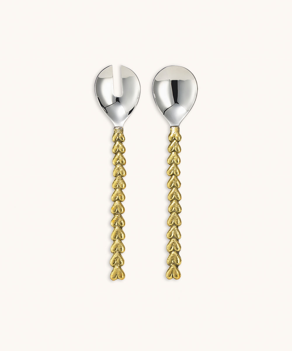 Add a romantic and stylish touch to your dining table with the Holly Heart Salad Server Set. This beautiful set includes a salad spoon and a salad fork, each featuring an elegant handle decorated with a row of delicate golden hearts. Handmade from recycled brass and high-quality stainless steel, these salad servers are true eye-catchers for any occasion.