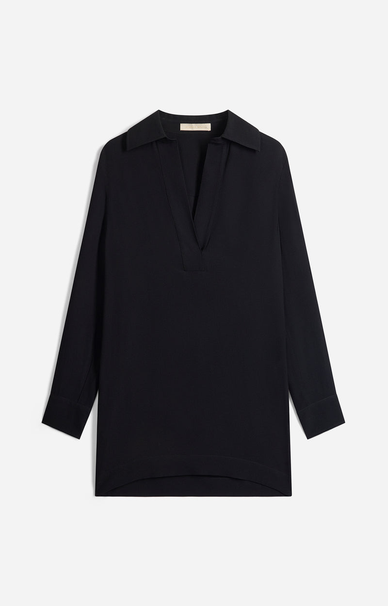 A little shirt dress with a straight cut, offering understated elegance and versatility.