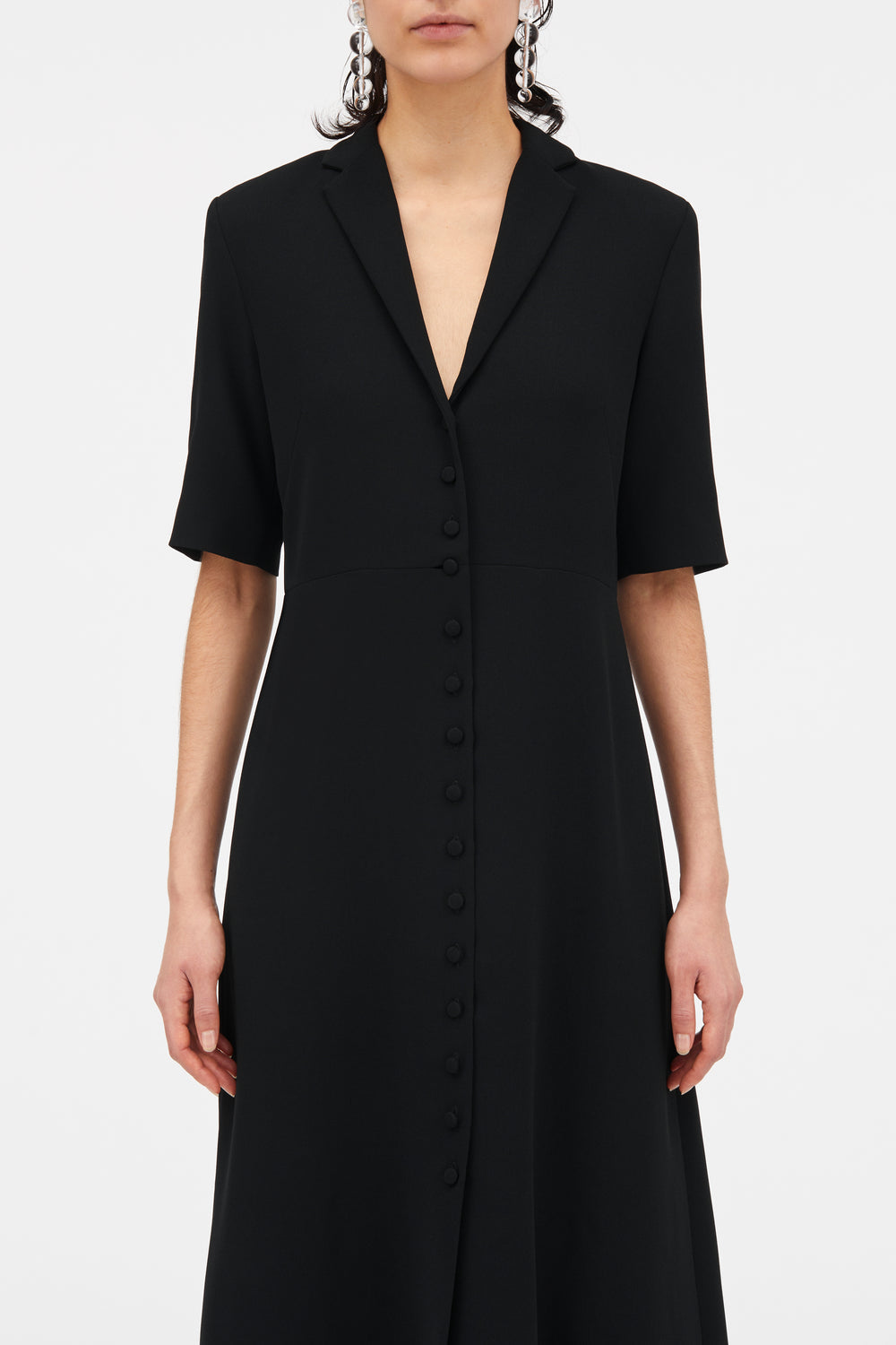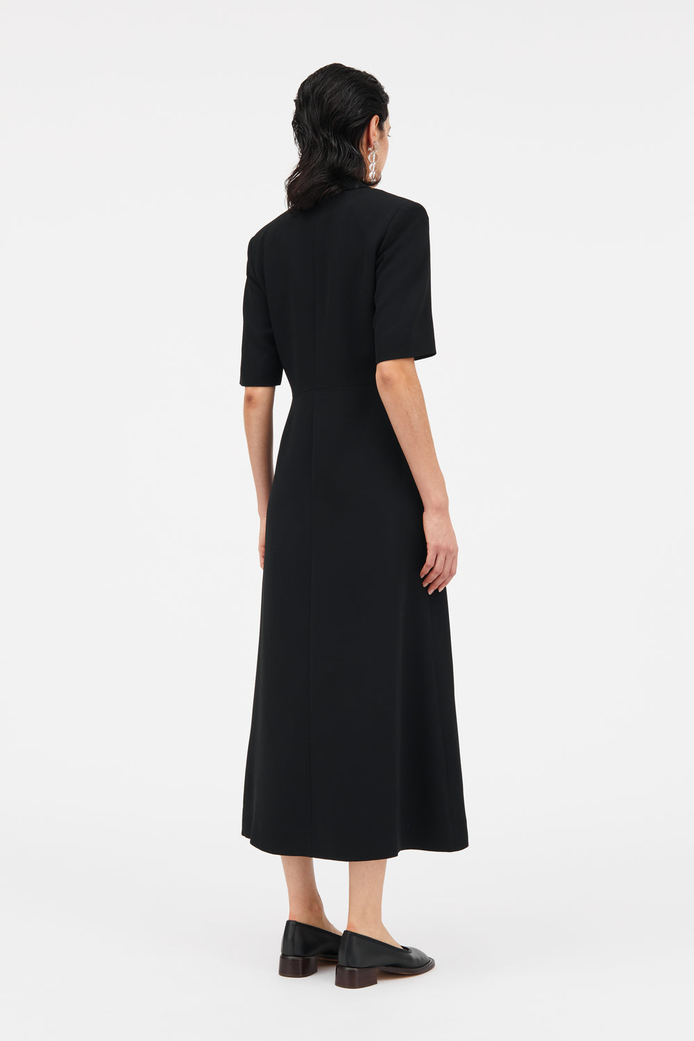 This anthracite, black dress combines minimalist luxury with a refined, architectural design. The mid-calf length and deep V-neck with collar create a sophisticated silhouette that is both timeless and modern.