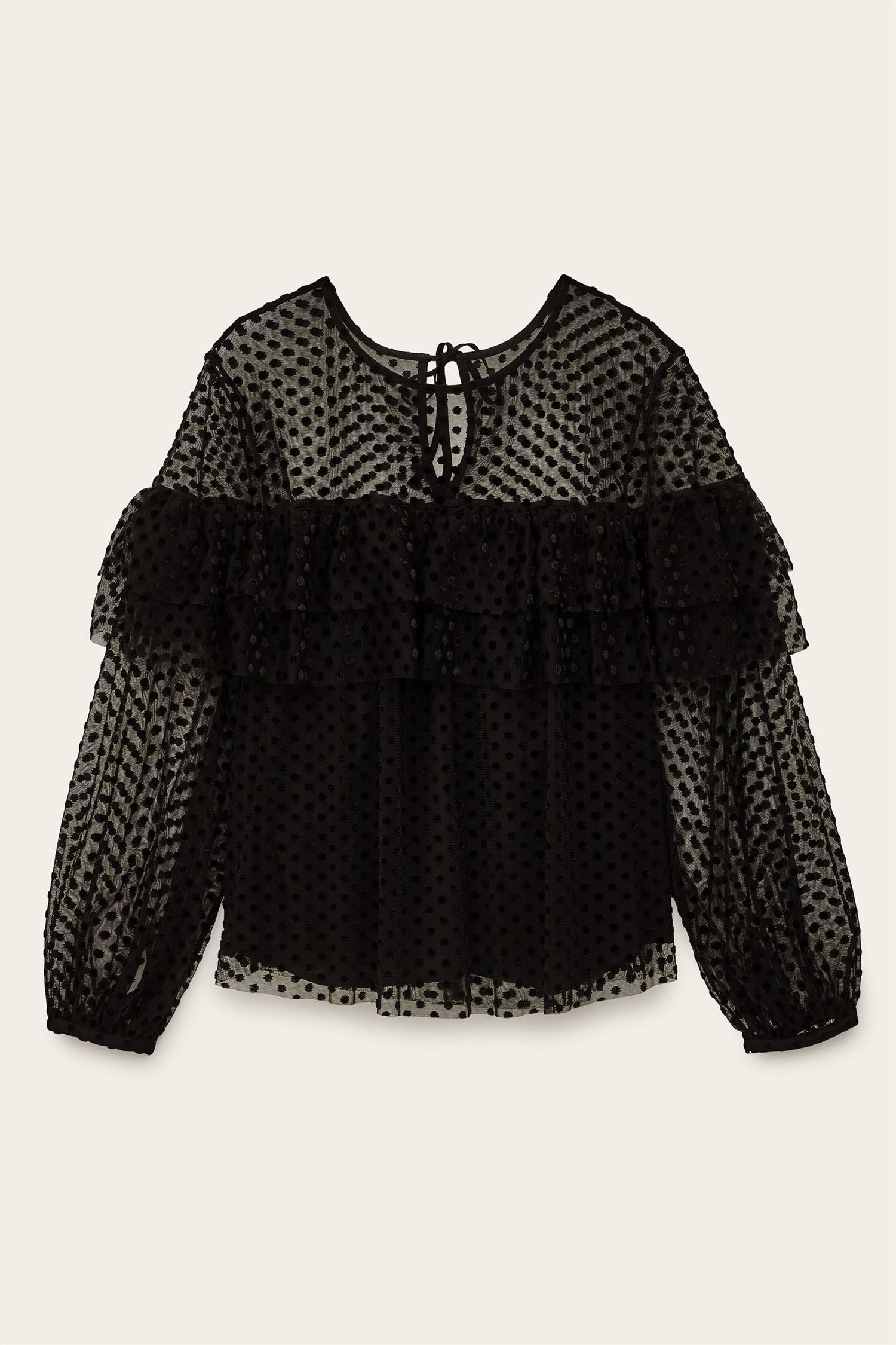 - Panel detail with two ruffles continuous with the sleeve just above the chest