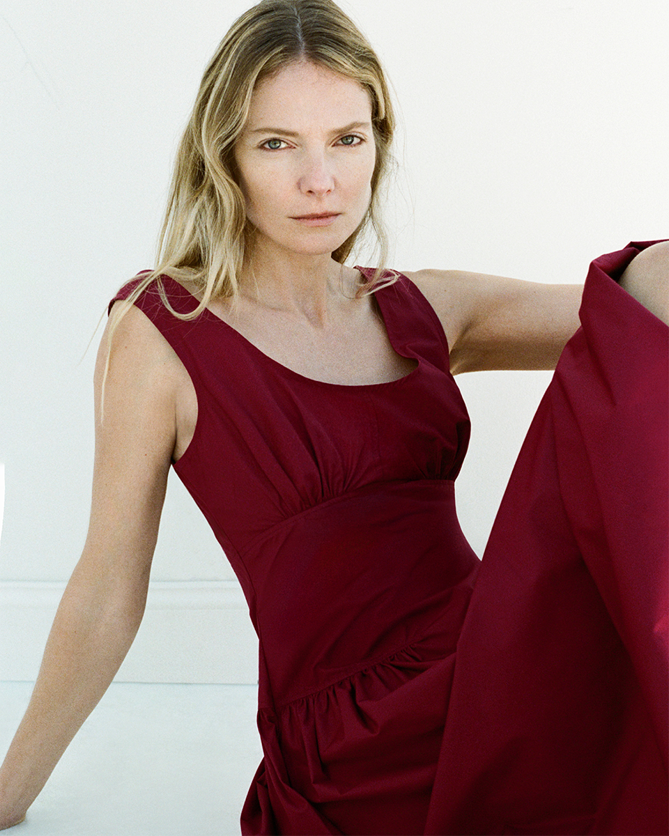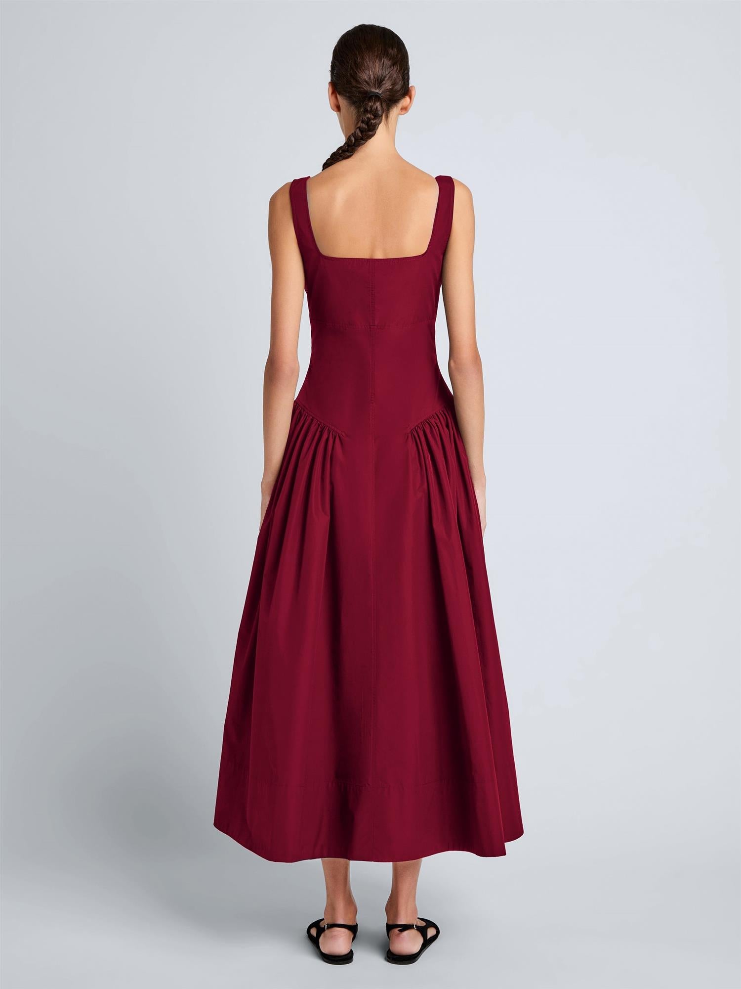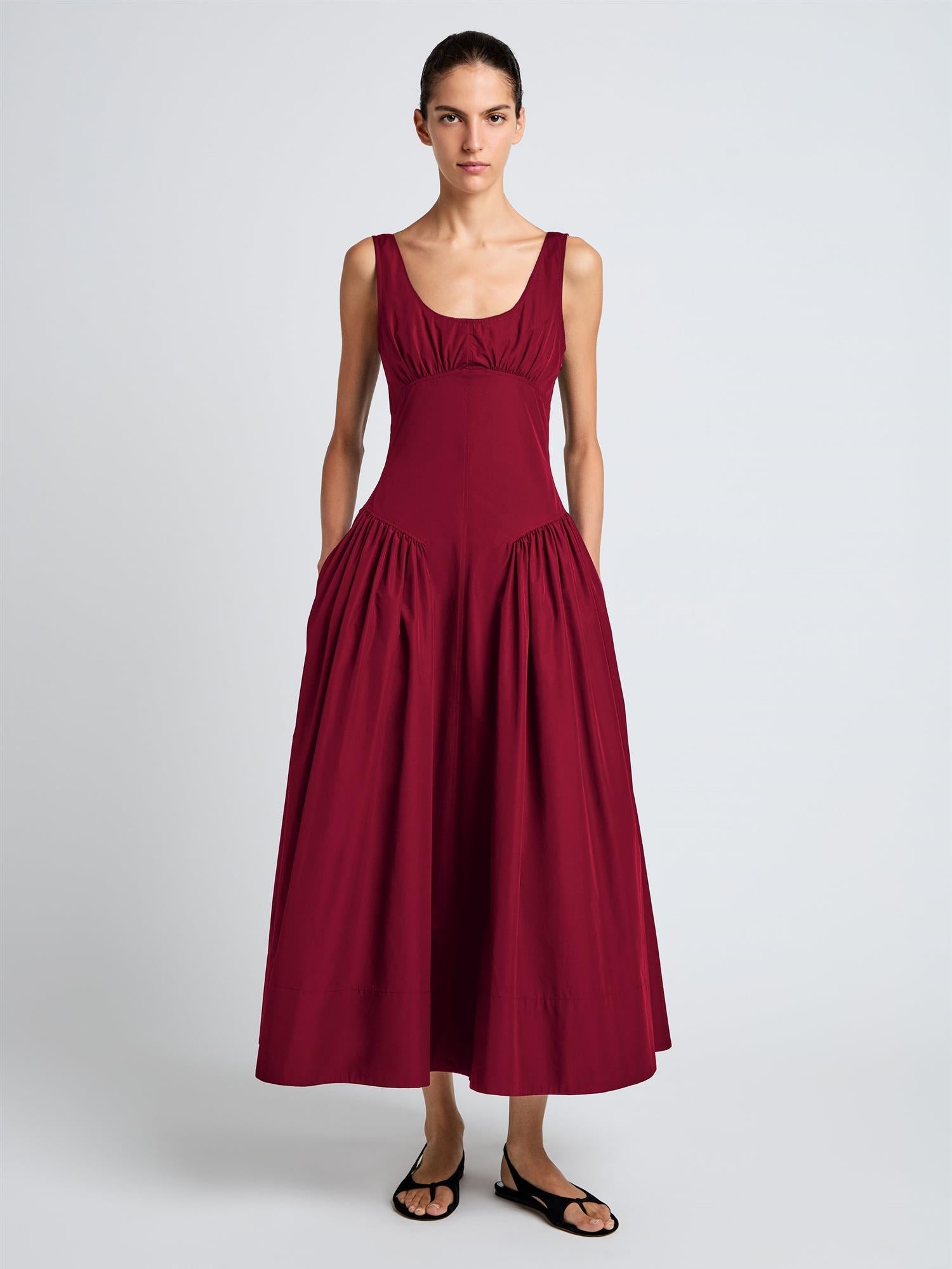 The Kendall Dress in Tech Cotton boasts a relaxed silhouette with a scoop neckline, flowing into a drop waist and mid-length hem. Finished with slip pockets and side pleating.