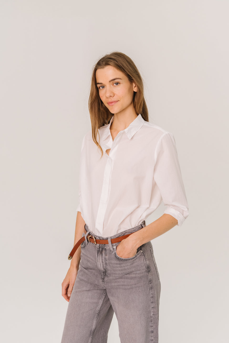 Long-sleeved cotton shirt with a relaxed, clean cut. Classic shirt collar and concealed button placket for a clean silhouette. Back yoke and wide pleat for added fluidity.