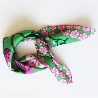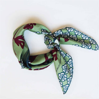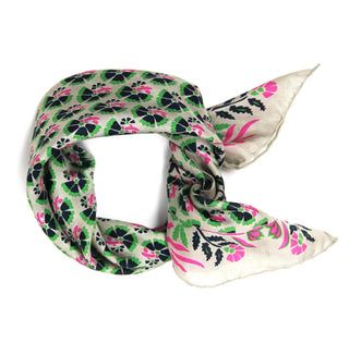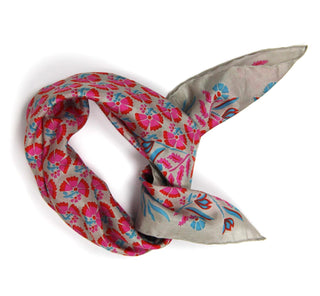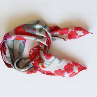 Skjerfene er håndtegnet i Frankrike, håndtrykt i India, og kommer i en eske inspirert av vintage fyrstikkesker.