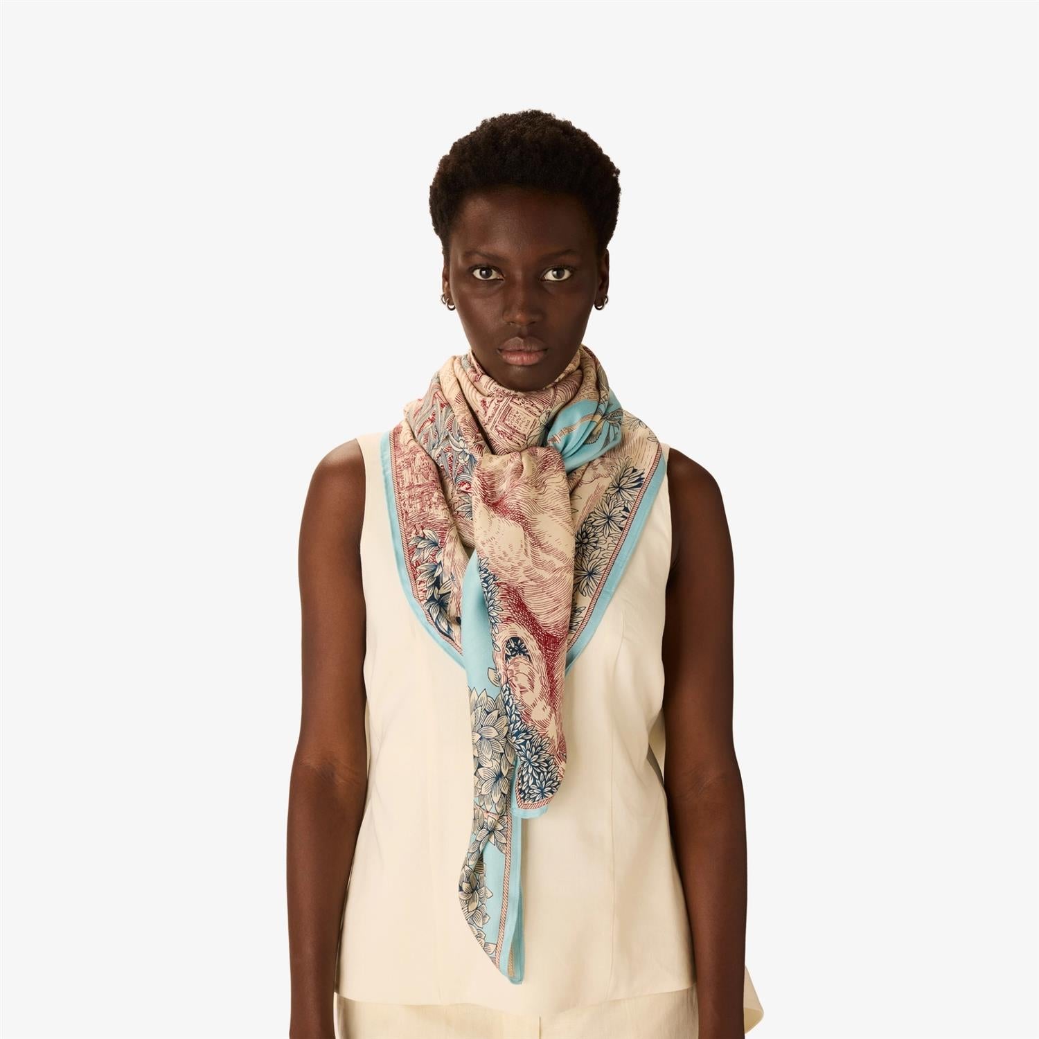 A staple at Inoui Editions for several seasons now, the square scarf is now a staple in our collections, and comes in a variety of sizes depending on the design. It can be put to many different uses, bringing art and clothing together and becoming a playful and versatile part of any outfit. The 130x130 square scarf can be worn around the neck or tied into a skirt or wrap-around top.