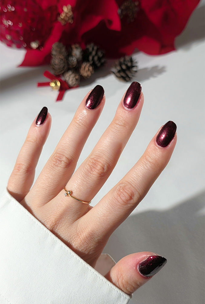 Our glazed red-black is inspired by fine wine and seasonal festivities. Rich, bold and sparkling, it shimmers under party lights, smoulders in the shadows and bestows an utterly mesmerising manicure.