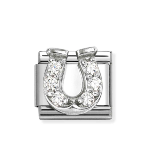 Original Nomination Composable Classic Link for Composable bracelet in stainless steel with silver Horseshoe symbol, decorated with sparkling white Cubic Zirconia. This Link is a symbol of good fortune and refinement and is an invitation to live life to the fullest.