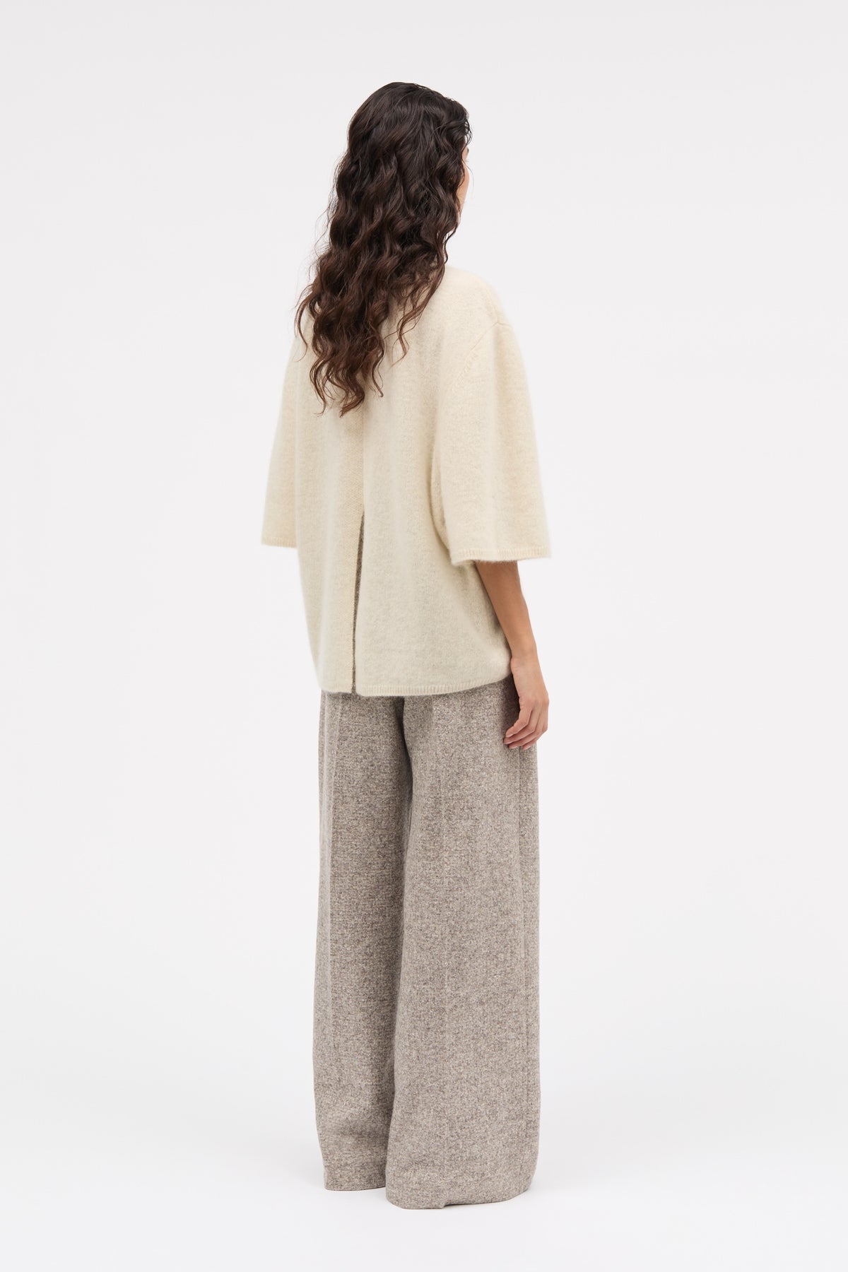 Discover the minimalist luxury of this ivory knitted blouse, featuring bat sleeves and a loose fit. Perfect for those who appreciate refined and architectural design, this piece embodies a calm elegance rooted in Nordic aesthetics.