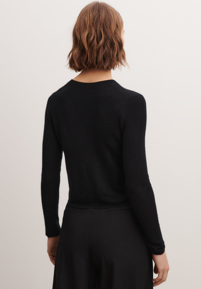 Cropped cashmere and silk plain knit cardigan. Timeless feminine fit.