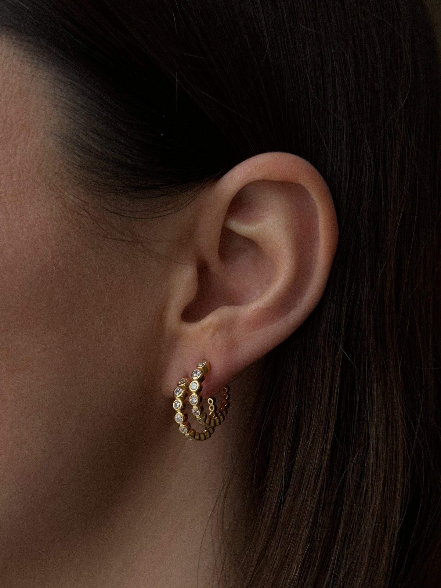 A subtle brilliance in simplicity, the stud earring adorned with small, round, clear crystals is a refined adornment.