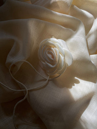 Stain Rose String har tre bruksmåter: Med tråd rundt hal eller som belte, festes på klær med sikkerhetsnål, eller festes i håret med klemme.