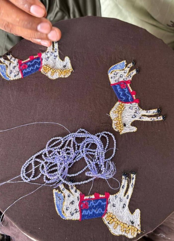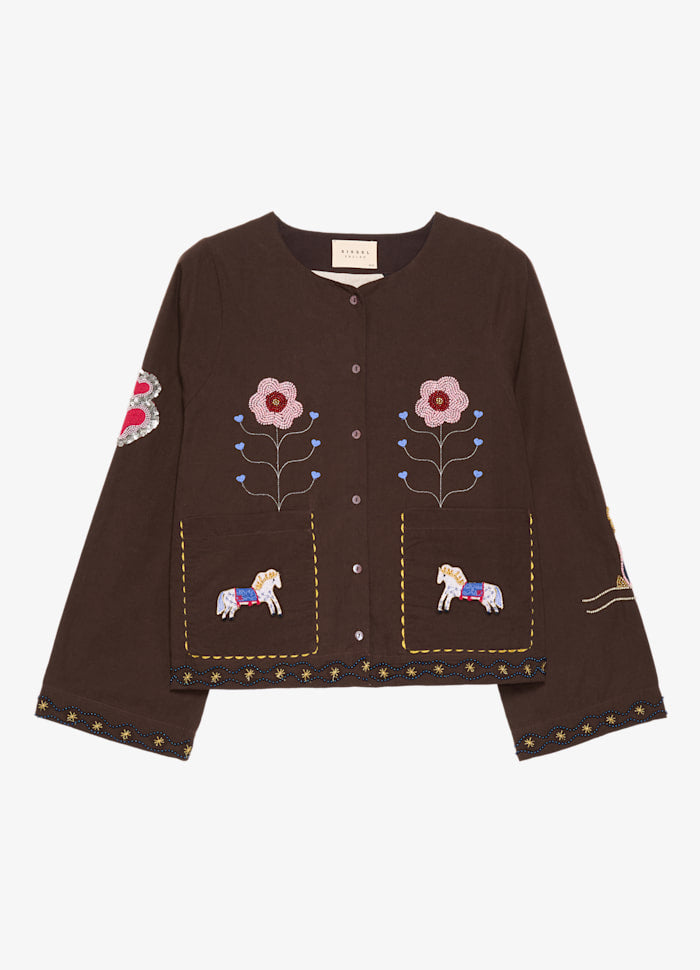 Emmy Top is a feminine top made from 100% organic cotton. It features long, straight sleeves and an O-neckline. The front placket is adorned with frog buttons made of golden metallic thread. The top has two front pockets decorated with golden metallic ribbon, and it is embellished with a cute, magical universe consisting of flowers, hearts, and horses, created with beads, embroidery, and sequins. The shirt is lined with organic cotton featuring a dot print.