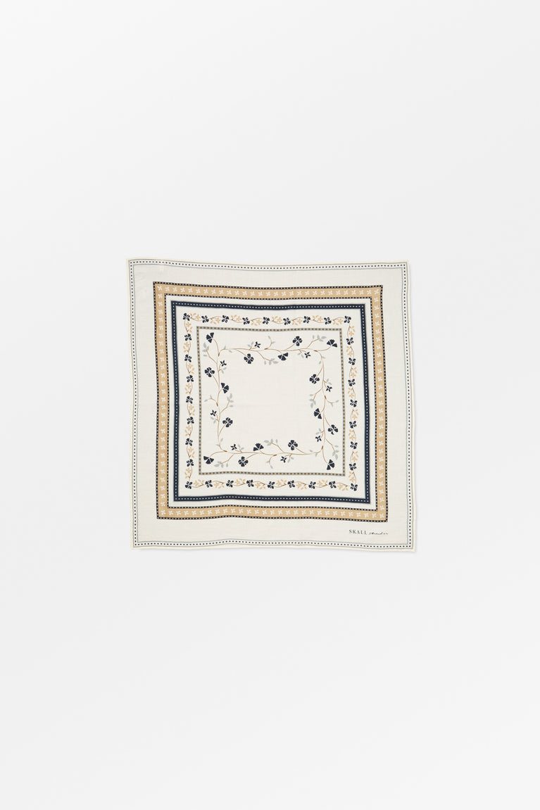 Skall Floral Scarf is a small 100% cotton scarf in a design that features delicate flowers inside a square border. It is the perfect finishing touch to an outfit when tied around the neck.