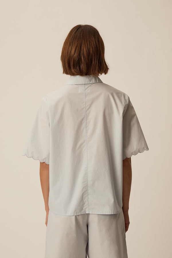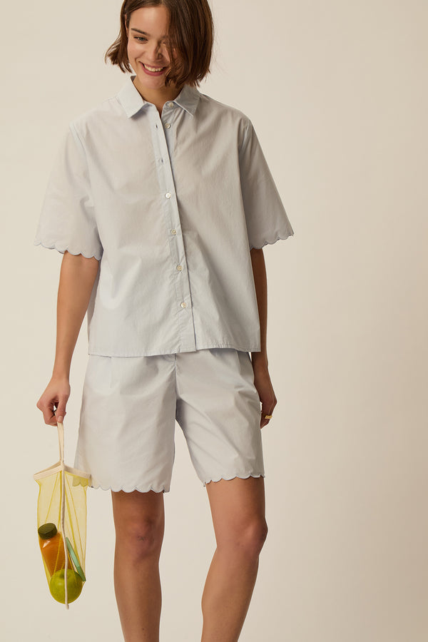 Inspired by nightwear, the Rebeka short-sleeved shirt is made from soft, lightweight cotton poplin, perfect for summer. Its straight cut is enhanced by scalloped short sleeves. Pair it with the matching Bermuda shorts for a chic and feminine silhouette that can be worn indoors or out.