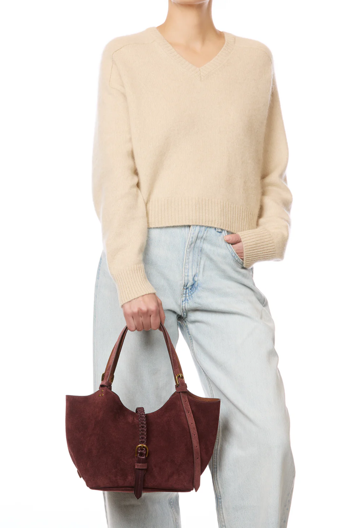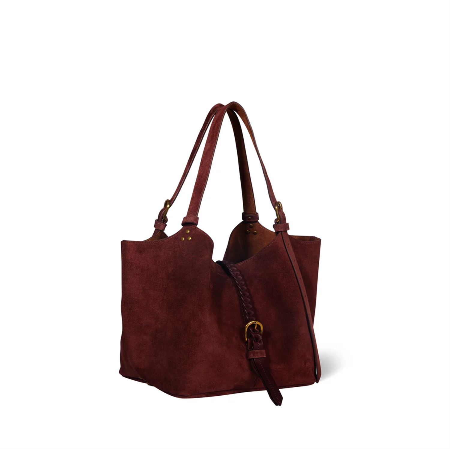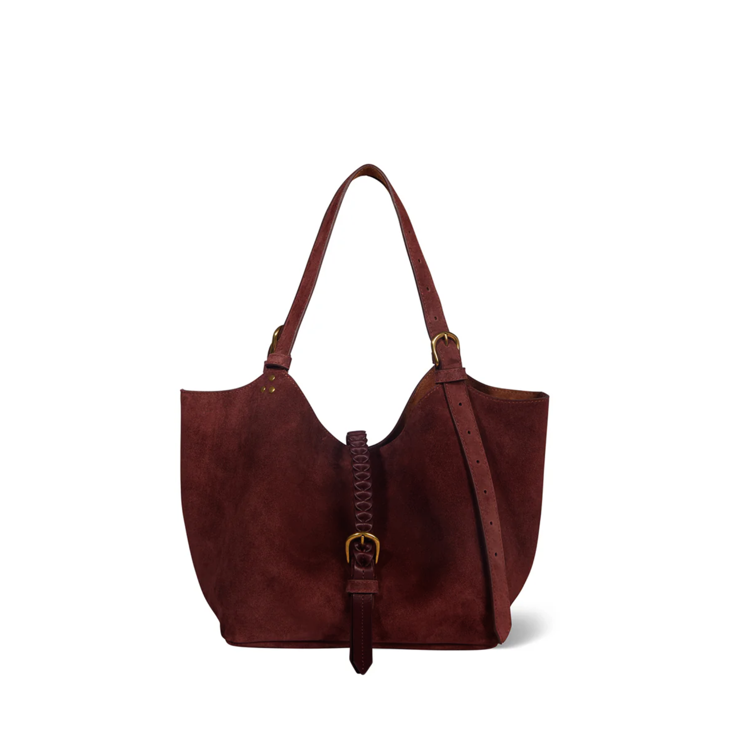 Bag with adjustable handles from 25 cm to 56.5 cm, allowing for hand or shoulder carry. Closure with a hand-braided central tab. Designed with a single main compartment and a pouch attached inside with a leather tie.