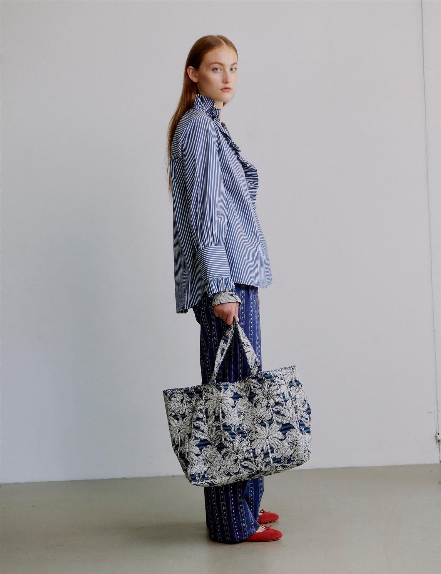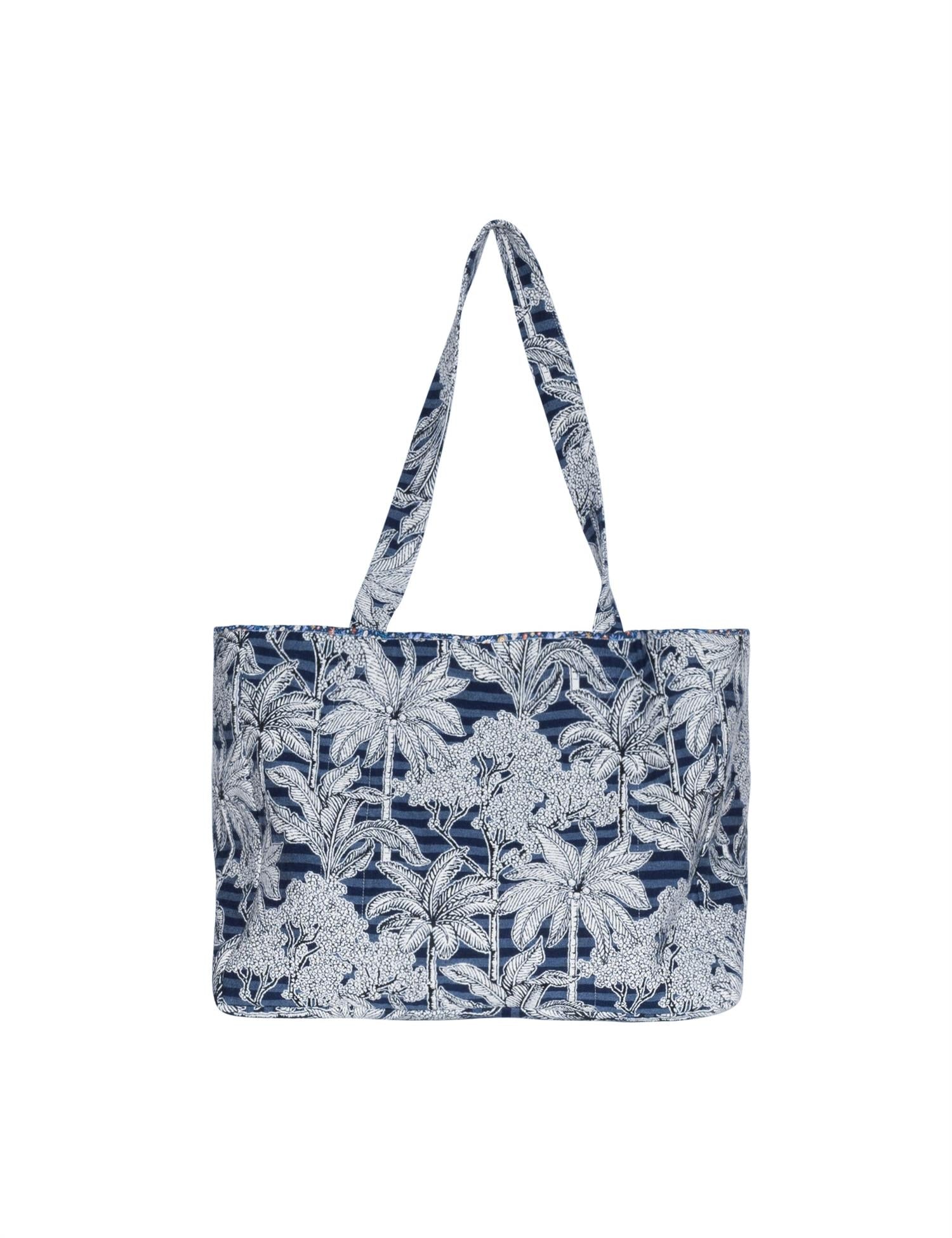 Pam Shopper in Blue Palm Escape balances lightness and volume, offering a practical yet decorative carry-all. The soft panels and woven botanical pattern make it ideal for everyday use, short outings, or as an extra on-the-go companion.